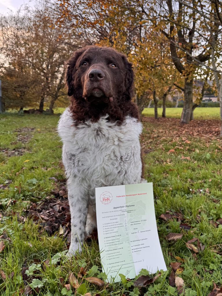 FHN diplomadag in Oosterhout. Hauke heeft er zin en behaalt vrij gemakkelijk alle onderdelen. Alle verliespunten zijn te wijten aan fomo-gedrag, bv. een kraai die opvliegt als ik start met volgen, overvliegende reigers bij het kort apport en gegrom elders op het terrein bij het komen op bevel. Verder dikke prima, nergens gepist en zelfs een tevenplasje op het volgparcours genegeerd (!). Resultaat is maar liefst 6 punten meer dan vorige keer. Trots op mijn vent!